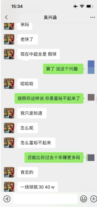 陈晨还晒出了和吴兴涵的聊天记录,吴兴涵向她透露可以通过赌球来盈利:“现在中超全是假球。肯定的(比过去10年踢球都挣得多)!一场球就30、40万。”