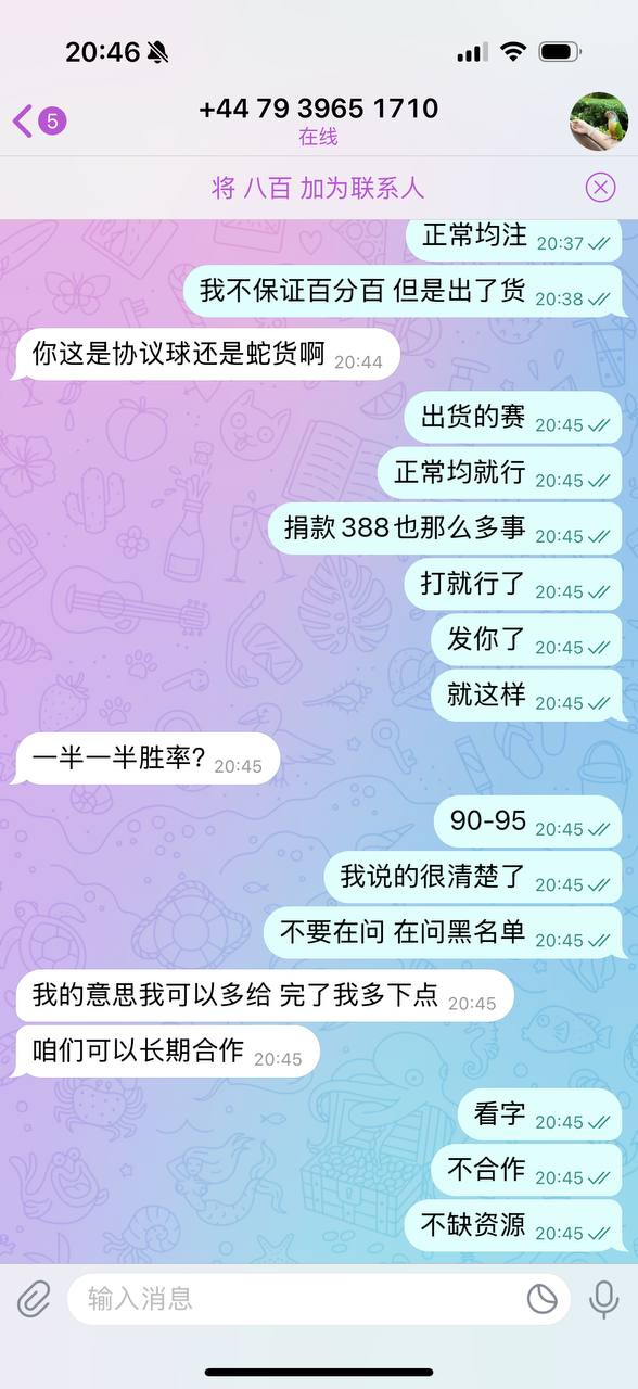 一:进行合作的客户须知,我们是坚决不与中介合作,里面充满太多变数,我们来到电报就是为了直面客户,不愿意被中间恶意曲解,所以如果有中介您不需要咨询我,我们工作室是支持上压的,但对资源有所划分,如果你是普通皇冠平网或者是普通现金网,我们是不走担保的,即使走,我们的要求你未必能接受,因为这种资源是最容易拿到的,它并不属于优势资源,在这类资源上我们并不缺,交到我们手上的此类资源没有几千万额度最少也达到一千万,我们会定期定点进行投注,让客户有所盈利为我们提供更优势资源,所以大家询问我们的时候,如果你是此类资源,我们是不支持上压的,没有必要去压一道资金,此类资源的话,进行划单或者平台不出款,我们是可以不追究客户赔偿的,合作是需要交号给我们这边的,交号只是为了比赛的私密性,即使你交了之后你也可以看后台,但我们也会有一定反制措施,信任是双向成立的,大家不必担心交号的安全性,如果是现金网平台,我们是不可能能把钱提取走的,因为需要验证码或者二级密码,如果是信用盘就更拿不走了,这类合作我们知道也会碰到个别客户换小号持续薅羊毛,我奉劝不要有这样的行为,我允许你逃单,但请不要换个用户接着来,那样子的话后果自负。